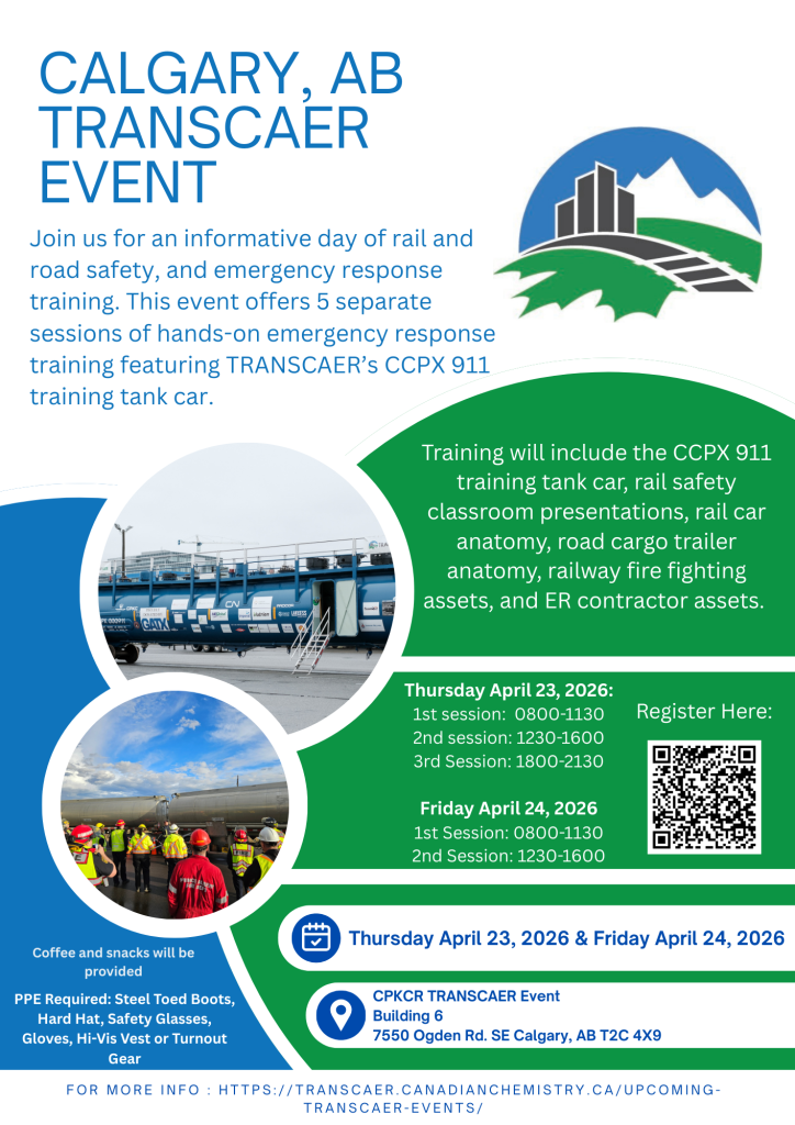 Join us for 5 separate sessions of hands-on emergency response training featuring TRANSCAER’s new CCPX 911 training tank car.